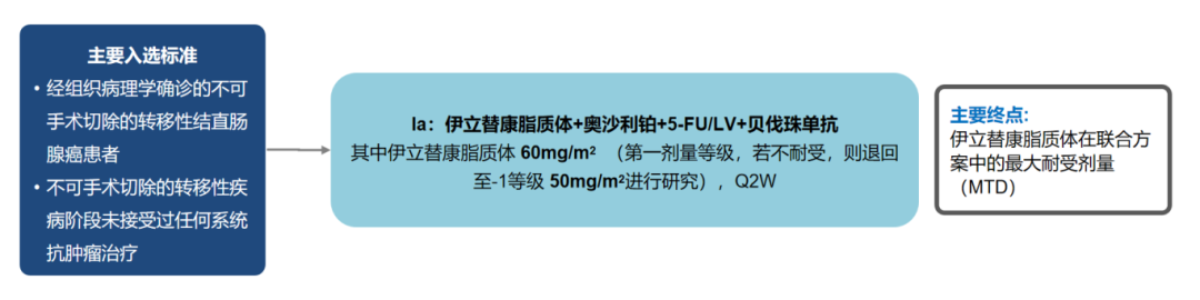 研究設計:這是一項多中心的I期臨床試驗,由復旦大學附屬中山醫院的劉天舒主任牽頭,納入既往未接受過轉移性疾病系統性治療的結直腸癌患者。研究Ia階段為伊立替康脂質體的劑量遞增研究,患者接受伊立替康脂質體聯合奧沙利鉑、5-FU/LV和貝伐珠單抗方案治療。