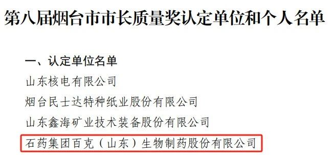 石藥集團百克公司榮獲煙臺市市長質量獎