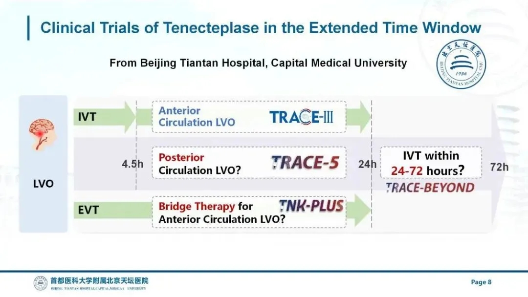 此外,首都醫(yī)科大學(xué)附屬北京天壇醫(yī)院王擁軍教授團(tuán)隊(duì)正在同步開展多項(xiàng)隨機(jī)對照試驗(yàn),持續(xù)深耕拓展靜脈溶栓治療時(shí)間窗研究。其中TRACE-BEYOND旨在研究替奈普酶超晚時(shí)間窗(發(fā)病24-72h)前循環(huán)大動脈閉塞的靜脈溶栓治療。TRACE-5旨在研究超時(shí)間窗(發(fā)病4.5-24h)后循環(huán)大動脈閉塞的靜脈溶栓治療。TNK-PLUS旨在研究超時(shí)間窗(發(fā)病4.5-24h)前循環(huán)大動脈閉塞的橋接治療。首都醫(yī)科大學(xué)附屬北京天壇醫(yī)院熊云云教授在國際卒中大會現(xiàn)場介紹了每項(xiàng)試驗(yàn)的研究目的、研究設(shè)計(jì)及當(dāng)前的研究進(jìn)展。