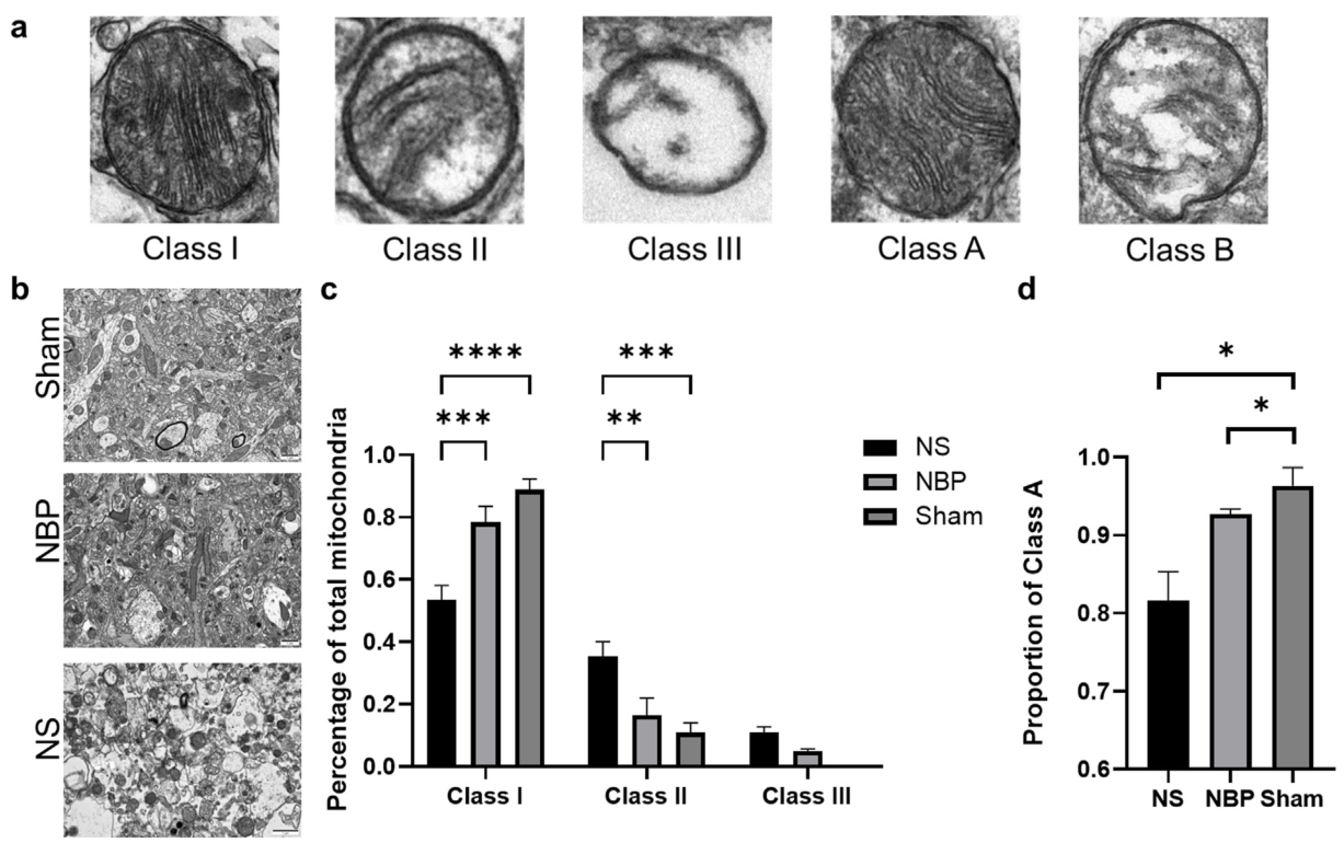 空間代謝組學的結果表明線粒體可能是NBP的靶點。為了進一步驗證這一假設,研究人員分析了線粒體的形態變化,包括線粒體嵴數、基質密度和腫脹。從形態學的角度來看,每個線粒體的嵴數量增加和基質密度增加表明線粒體功能狀態得到改善。線粒體嵴、基質密度和腫脹的分類如圖5a所示。分析結果顯示,NBP對于線粒體嵴、基質密度和腫脹表現出不同程度的改善作用(圖5b, c和d)。