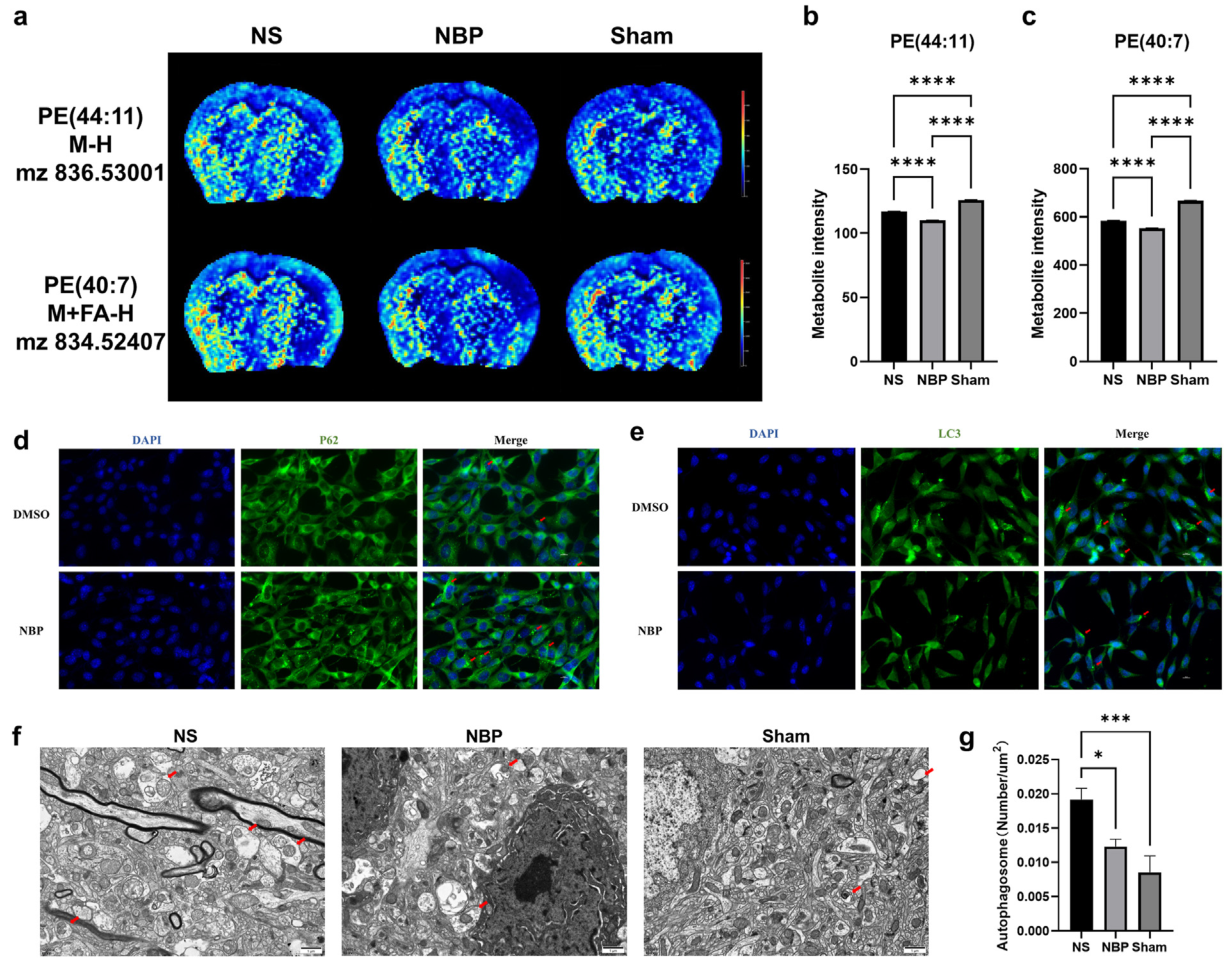 自噬是一種細胞機制,可以隔離受損/老化的細胞器、多余的蛋白質和細胞成分,因其在多種疾病中的潛在致病作用而受到廣泛關注。有研究表明磷脂酰乙醇胺(PE)是自噬的關鍵調節因子。在該研究中,代謝物分析顯示了自噬途徑的顯著下調,如PE水平降低所示(圖3j和6a),并通過定量分析驗證了這些發現(圖6b和c),表明抑制自噬可能是NBP的作用機制之一。在缺氧復氧細胞模型中,NBP組細胞的LC3表達降低,p62表達升高,表明NBP對于細胞自噬具有潛在的抑制作用(圖6d和e)。此外,透射電子顯微鏡(TEM)的結果也顯示了NBP處理后的神經元細胞中的自噬體的減少(圖6f和g)。綜上所述,這些結果表明NBP可能通過抑制細胞自噬發揮神經保護作用。