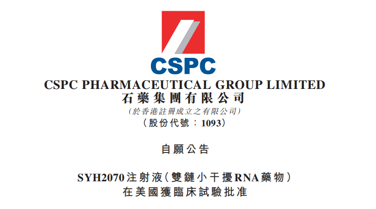 10月9日,石藥集團(1093.HK)宣布,本集團自主研發的化學1類新藥SYH2070注射液(雙鏈小干擾RNA(siRNA)藥物)(下稱:該產品)已獲得美國食品藥品監督管理局(FDA)批準,可在美國開展臨床試驗。該產品亦于2025年9月獲得中華人民共和國國家藥品監督管理局批準在中國開展臨床試驗。