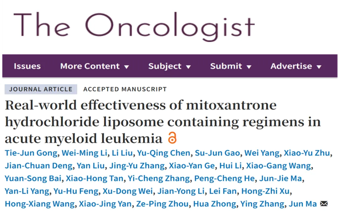 近期, 一項(xiàng)由哈爾濱血液病腫瘤研究所馬軍教授牽頭開(kāi)展的,鹽酸米托蒽醌脂質(zhì)體注射液治療急性髓系白血病(AML)的全國(guó)多中心、真實(shí)世界研究結(jié)果于《The Oncologist》雜志正式發(fā)表,該數(shù)據(jù)首次披露了真實(shí)世界中米托蒽醌脂質(zhì)體在AML患者的療效以及安全性,為其在白血病的應(yīng)用提供更多循證證據(jù)。