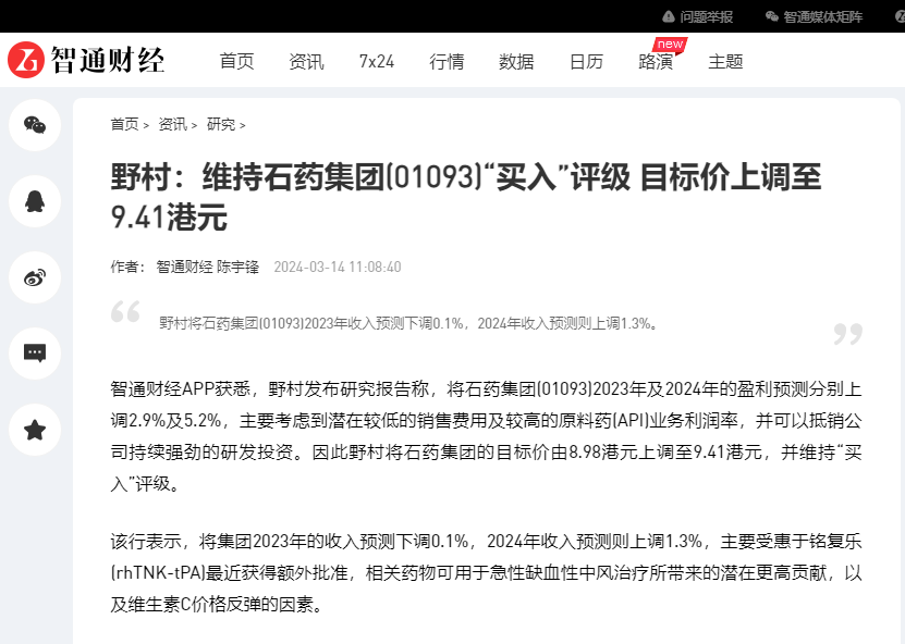 野村:維持石藥集團(01093)“買入”評級 目標價上調至9.41港元