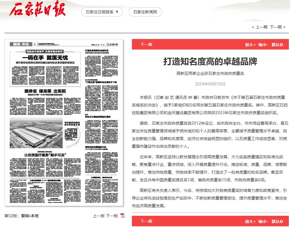 打造知名度高的卓越品牌——高新區兩家企業獲石家莊市政府質量獎