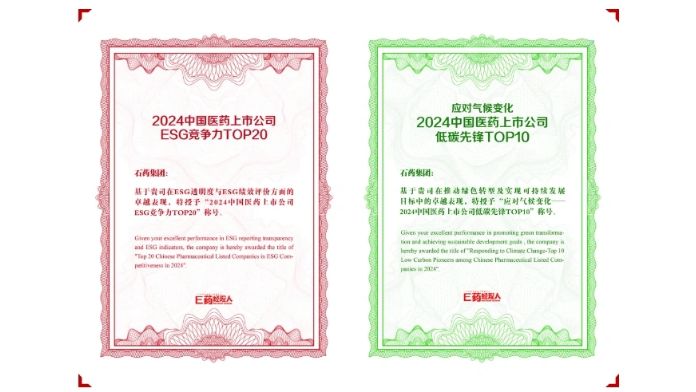 2024年11月14日,由中國醫藥企業管理協會、中國醫藥生物技術協會、四川省醫藥行業協會主辦,E藥經理人承辦的2024第16屆中國醫藥企業家科學家投資家大會(CHSESI,簡稱“啟思會”)在成都舉行。2024年度中國醫藥上市公司ESG競爭力系列榜單在會上正式揭曉,石藥集團憑借在ESG透明度與ESG績效評價方面的卓越表現,被授予“2024中國醫藥上市公司ESG競爭力TOP20”榮譽稱號;并基于公司在推動綠色轉型及實現可持續發展目標中的卓越表現,被授予“應對氣候變化2024中國醫藥上市公司低碳先鋒TOP10”。這兩項榮譽肯定了集團在環境、社會和治理(ESG)方面付出的努力和顯著成效,企業價值得到進一步的印證。
